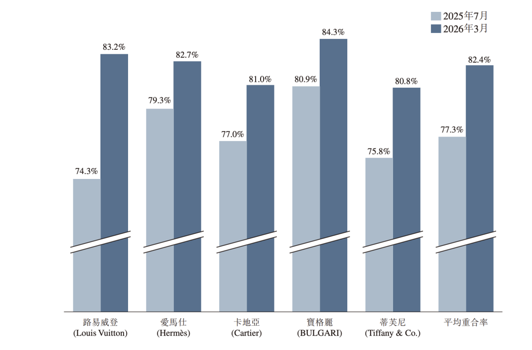 弗若斯特沙利文报告显示,老铺与五大奢侈品牌的消费者平均重合率升至82%
